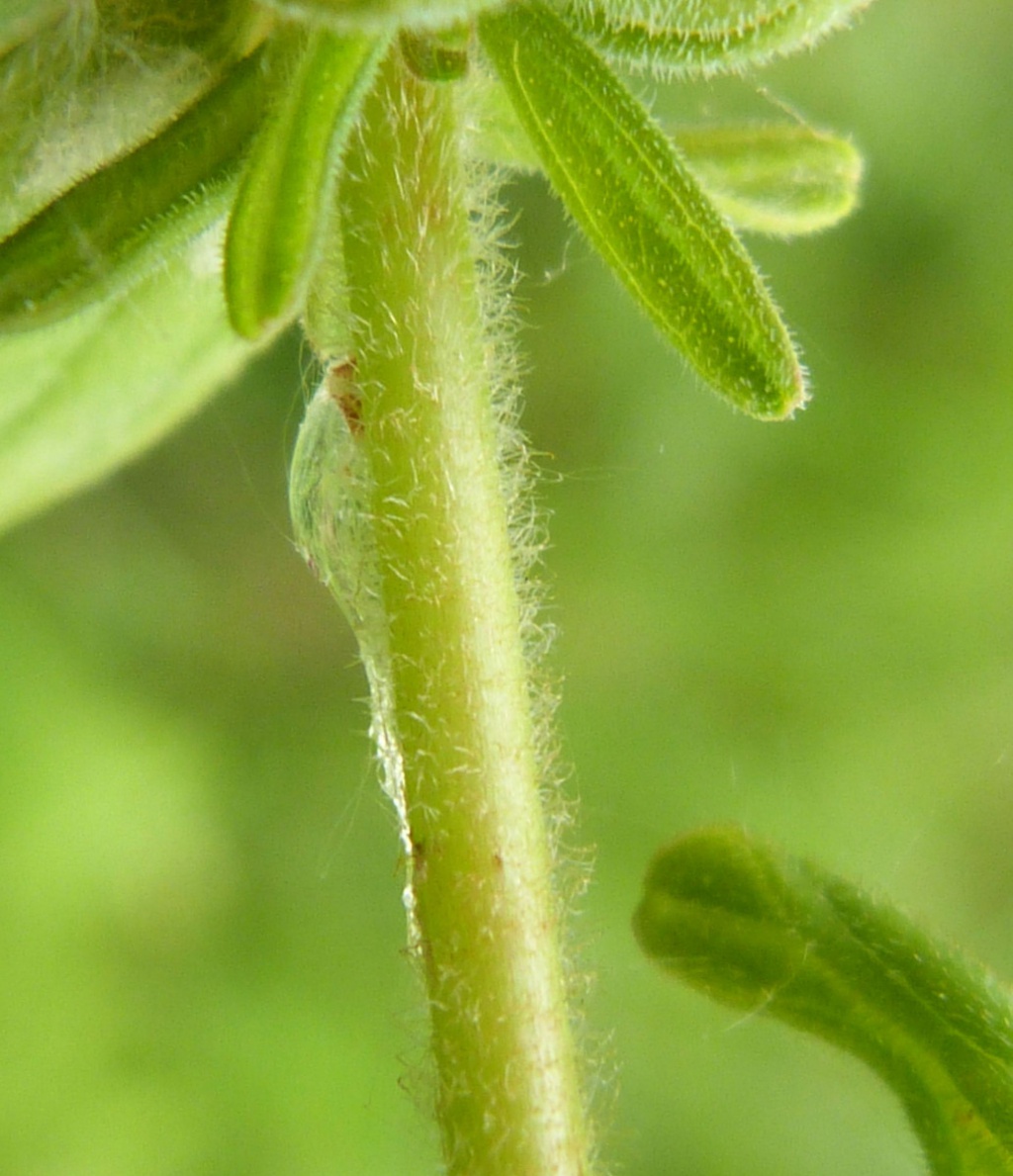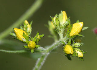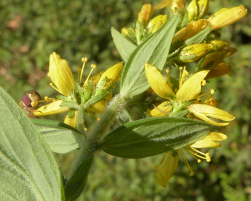 The only species of St John's-wort that has roughly hairy leaves and hairy stems and that does not grow in bogs. It is a medium to tall erect plant. The round section stem has two raised lines. The leaves have translucent dots but no marginal black glands. Flowers are pale yellow and sometimes red-veined borne in a lax many flowered panicle. The sepals are covered in tiny black spots.