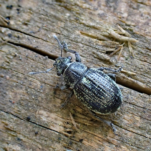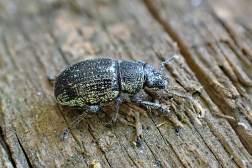 Size 3.4 to 4.5 mm. This is predominantly a black weevil, with a dusting of white scales down the side of the elytra and onto the pronutum.