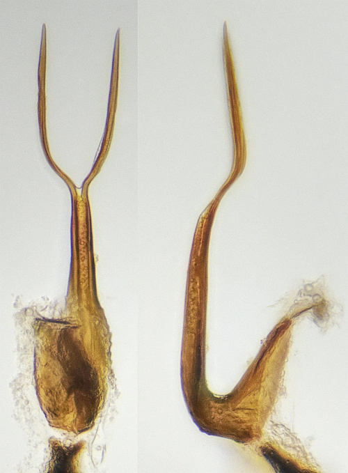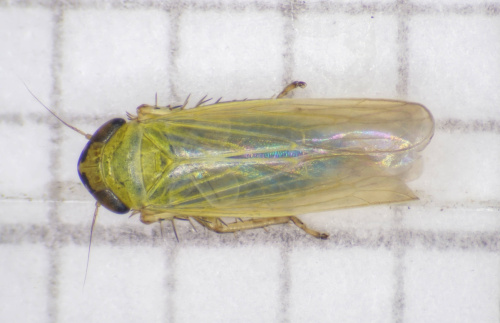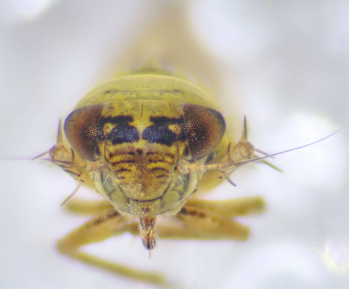 Length 2.9-3.8mm. Macrosteles is an extremely difficult and diverse genus. The vertex has several dark spots or bars and the frons has dark markings; both features are variable. The forewings are greyish or green-yellow, often with brown longitudinal streaks, patches or stripes, but colour and amount of the darker markings varies. Dissection of the male to examine the internal genitalia - the aedeagus - or the internal abdominal structure - sternal apodemes - is needed to identify.