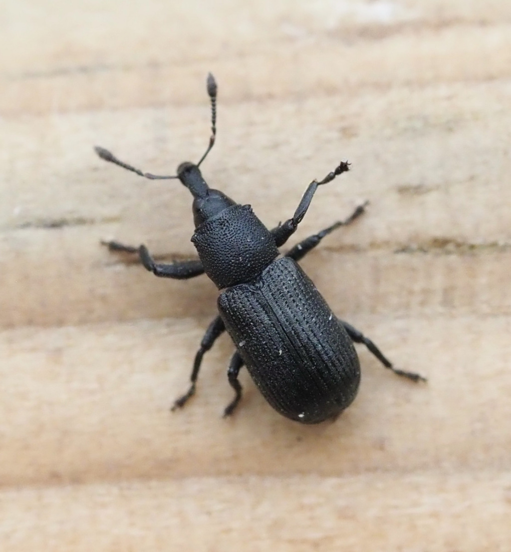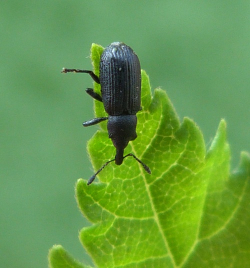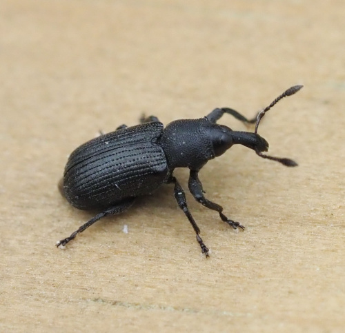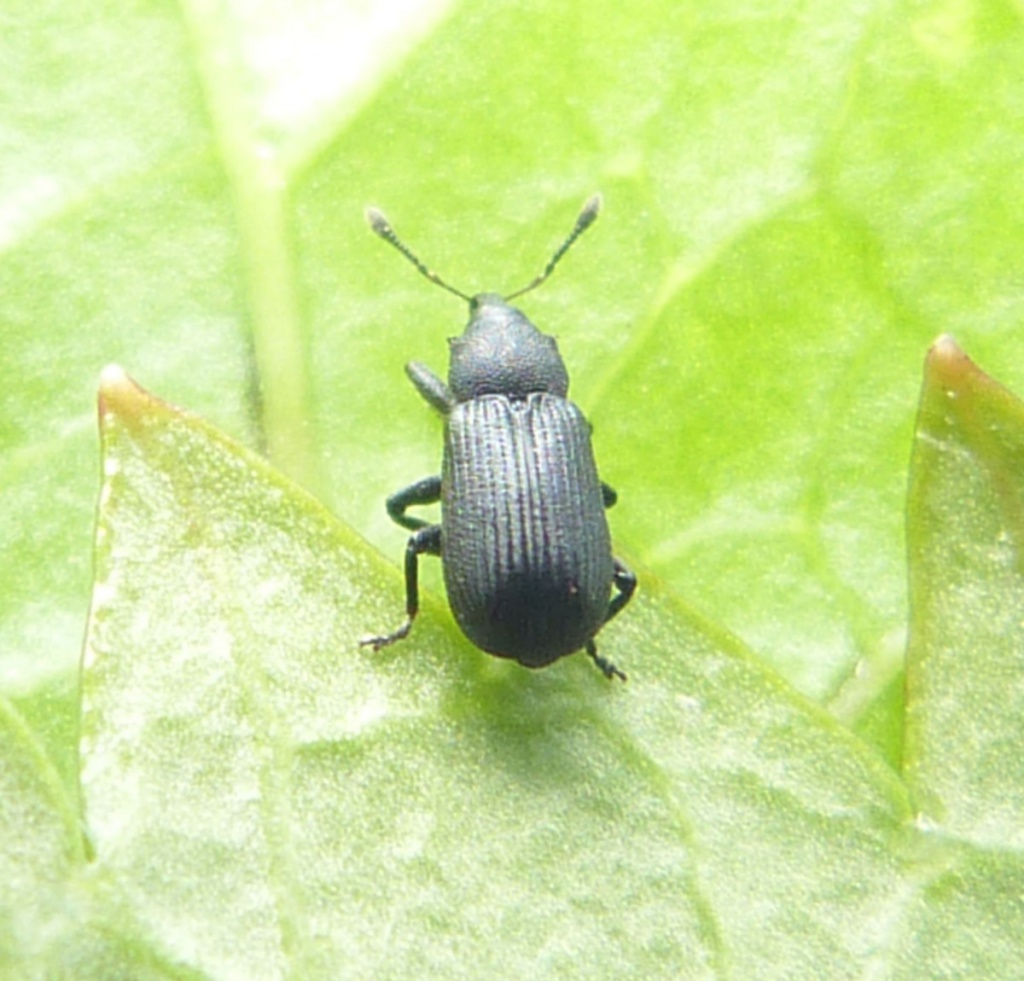 Length 3 to 4.5 mm. There are rows of puncturation on the elytra which are satiny, and a slate black in colour. There are quite large forward pointing projections on the shoulders of the pronotum These are larger and more forward pointing than in any other member of the genus, and so give a good indication as to species when a specimen is examined closely.