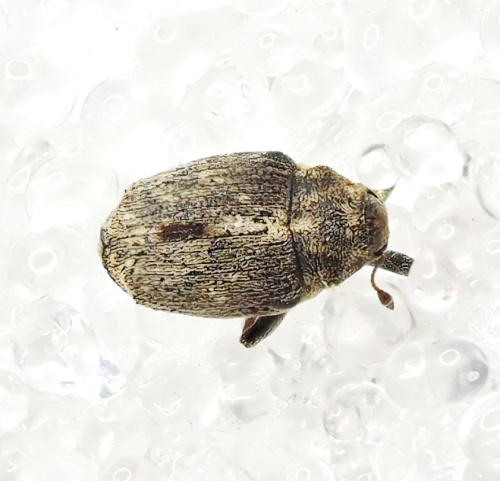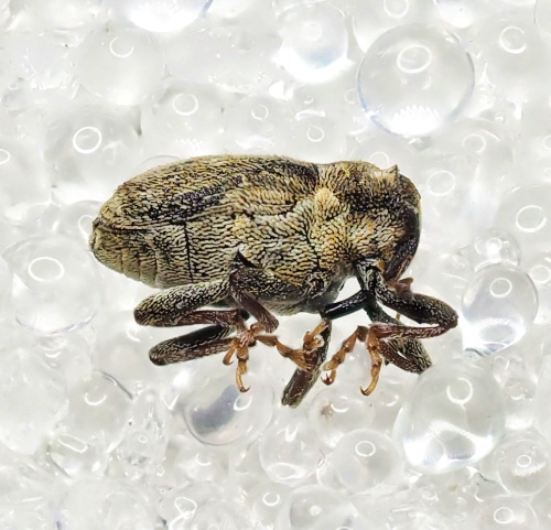 Microplontus campestris has a clearer white scale pattern that forms a 'W' across the elytra.
