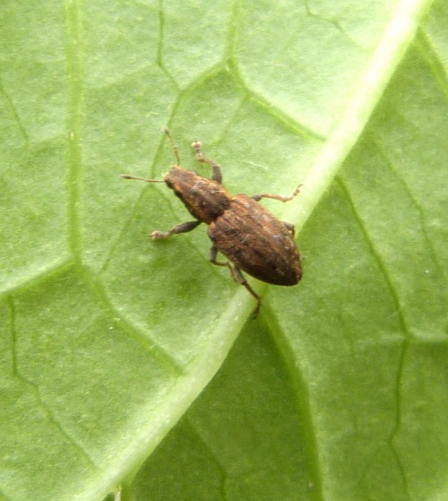 Length 4 or 5 mm. A brown weevil with rather a dark and light striped appearance when fresh. There are other weevils with a similar appearance and detailed examination is necessary for identification.