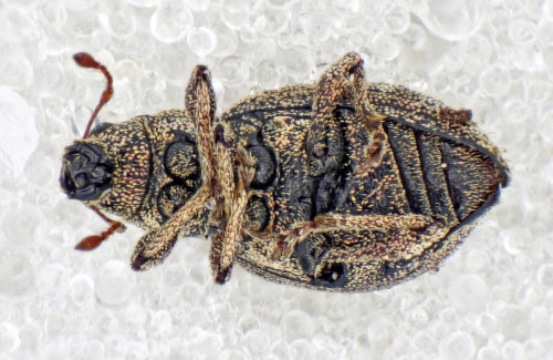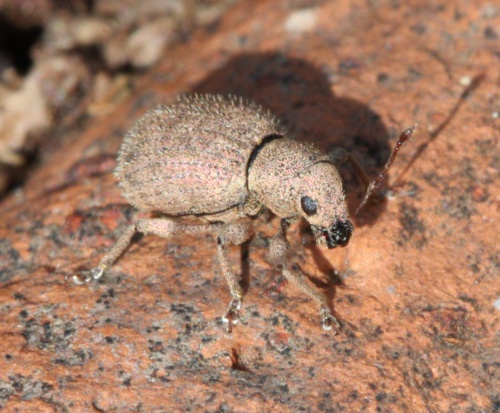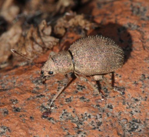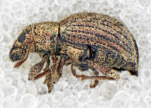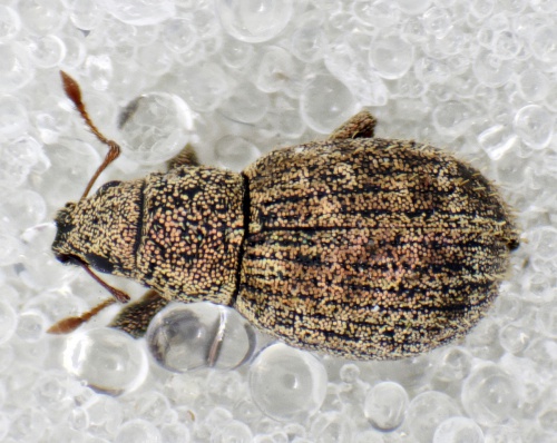 This weevil, is 4.5 to 5.5 mm in length, has a very short, blunt-tipped snout, no longer than its head; a light brown to reddish-brown body with extensive black speckling and scattered white scales. The elytra have black punctate striations and short erect hairs; the brown surface scales often become rubbed off, revealing black ground colour in places, giving a "black-scratched" appearance.