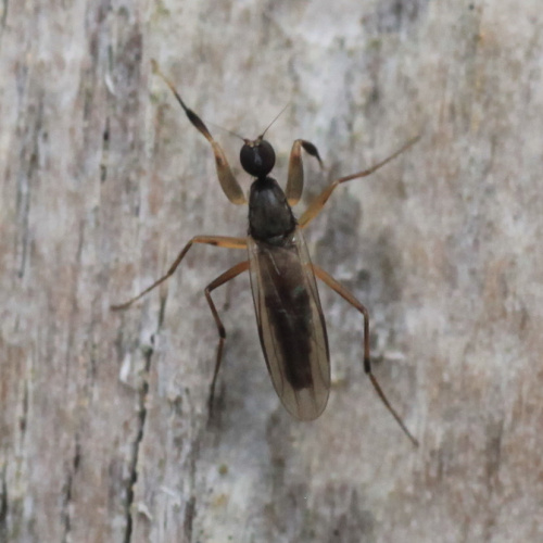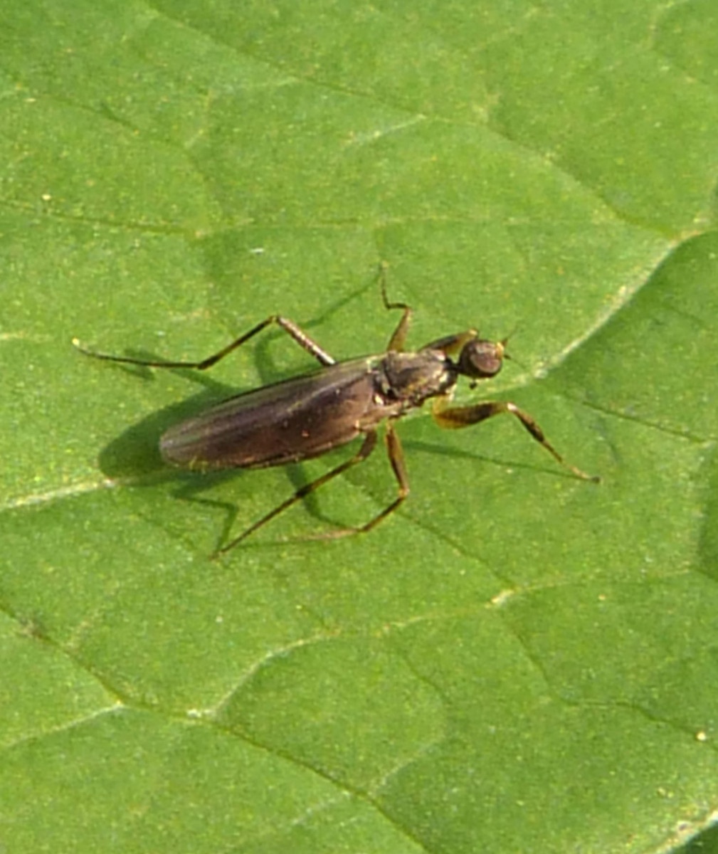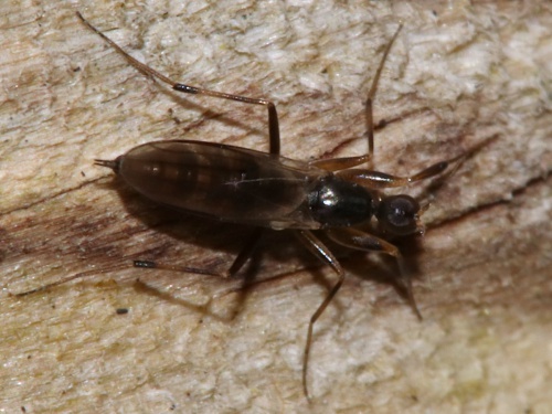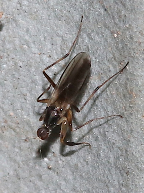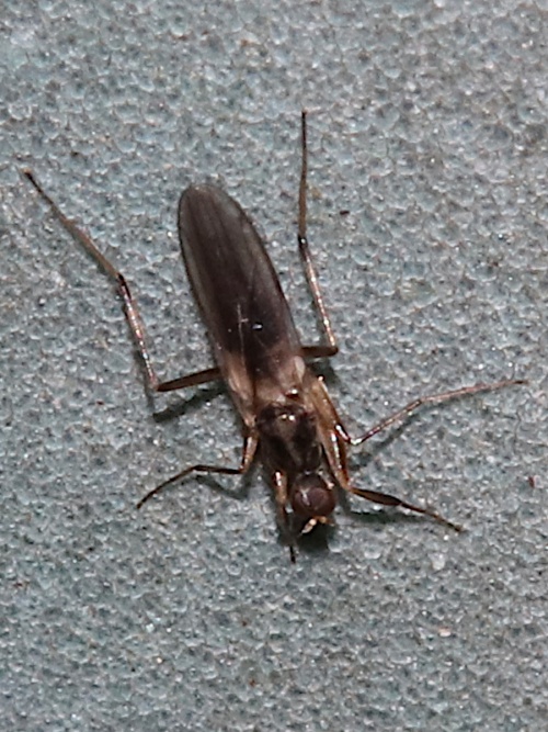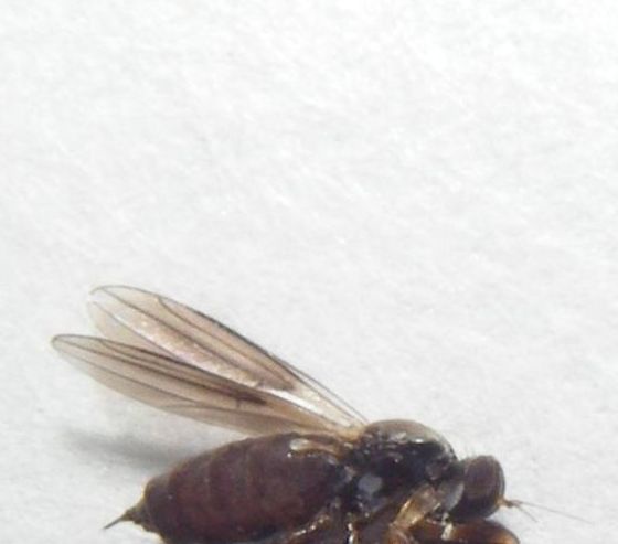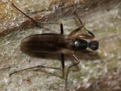 Length 2.5 to 3.5 mm. A small dark brown looking fly. The front legs appear to have swollen thighs and are slightly more yellowy brown. The wings have a dark shading.