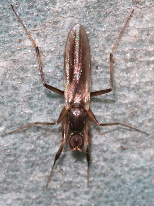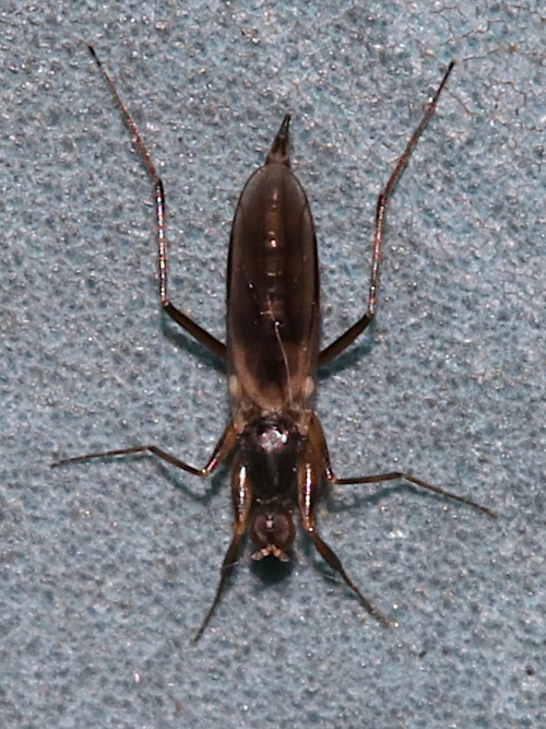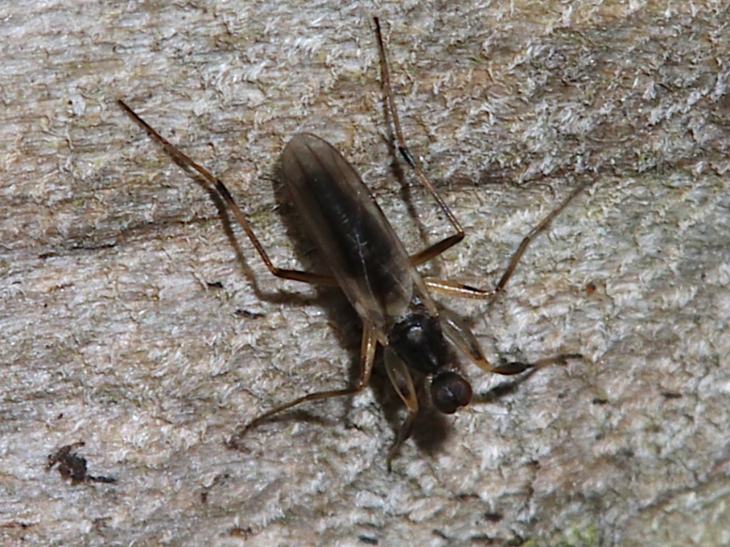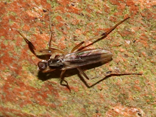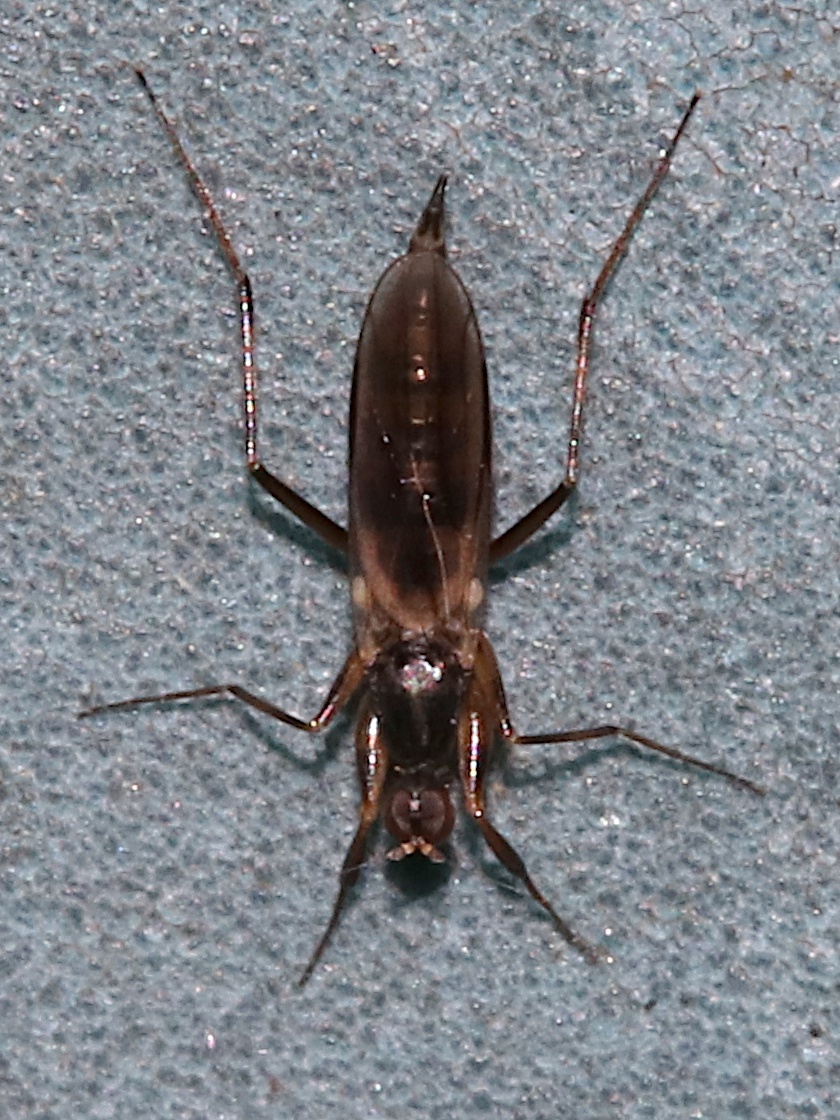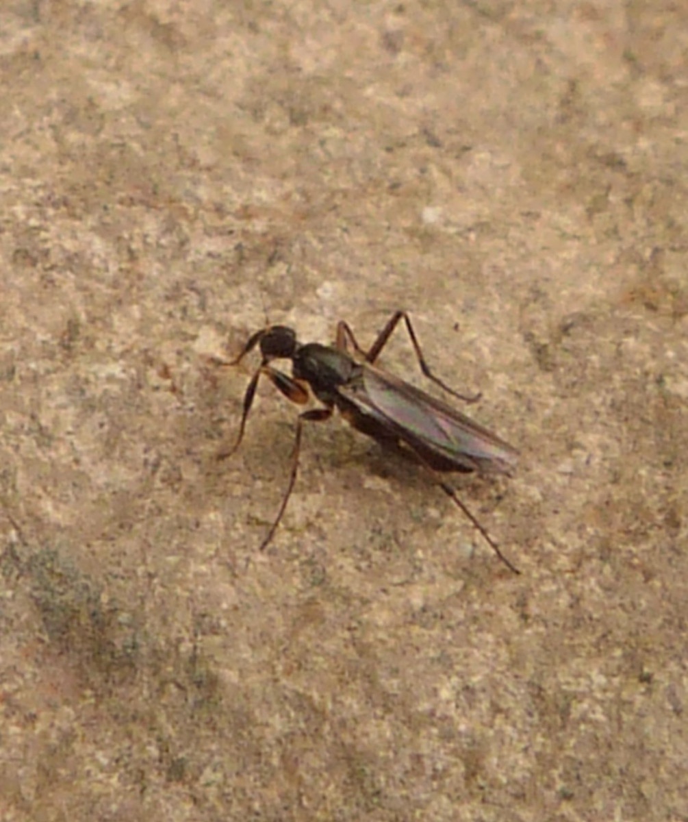 Length 2.5 to 3.5 mm. A small dark brown looking fly. The front legs appear to have swollen thighs and are slightly more yellowy brown. The wings have a dark shading.