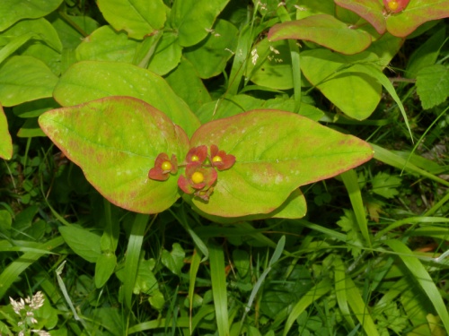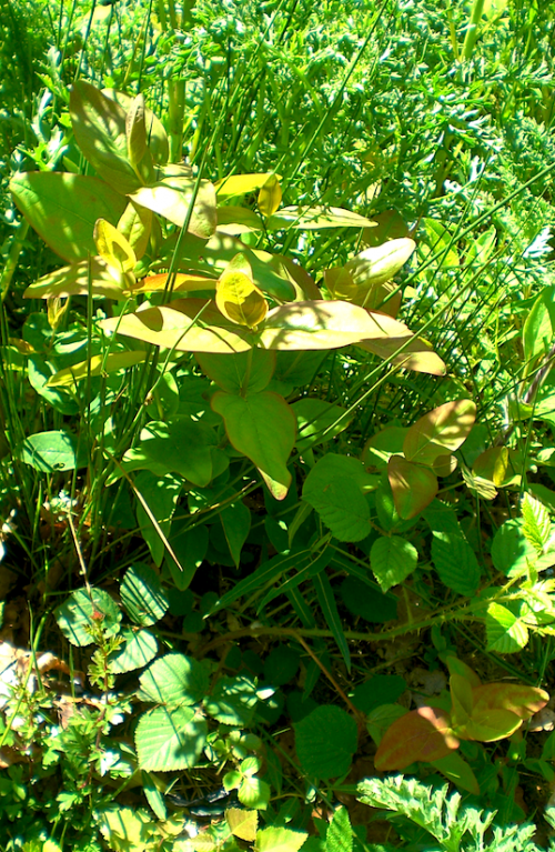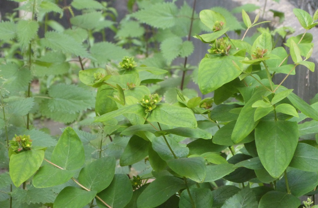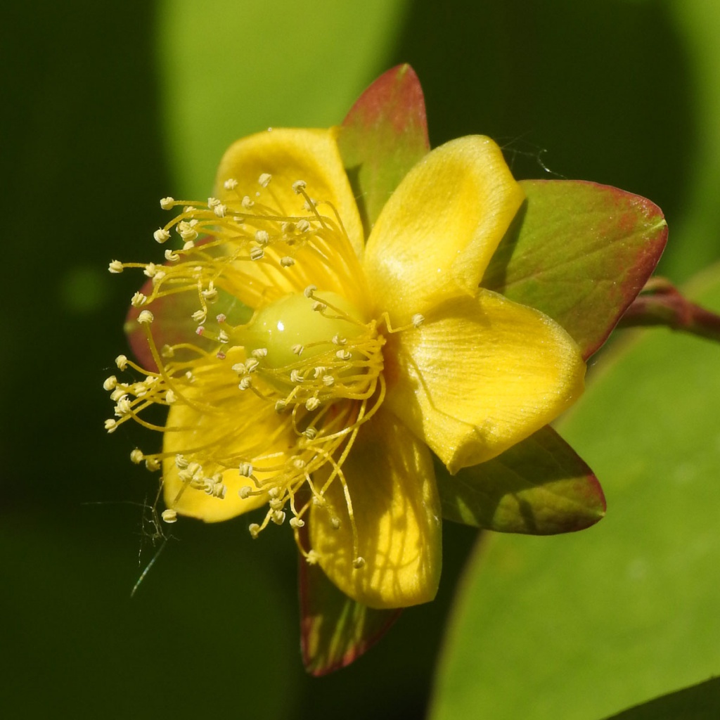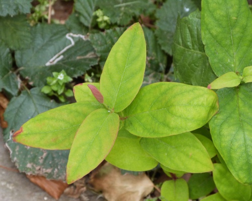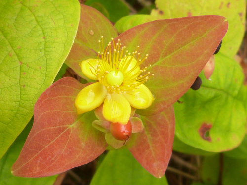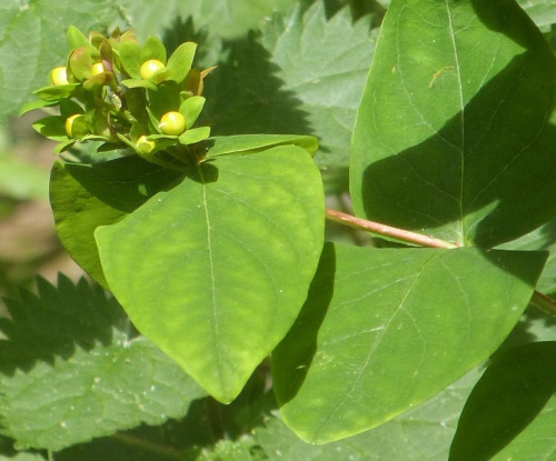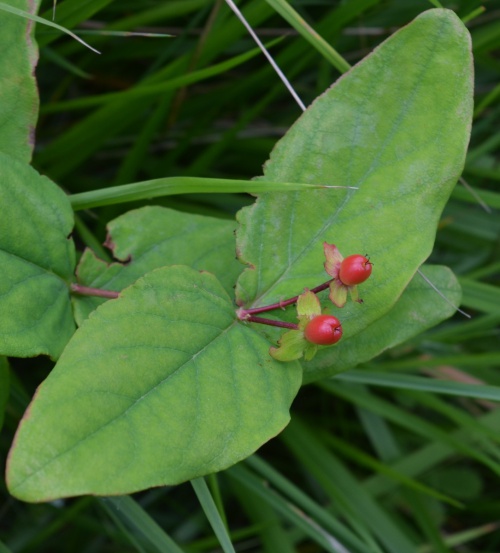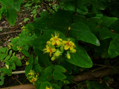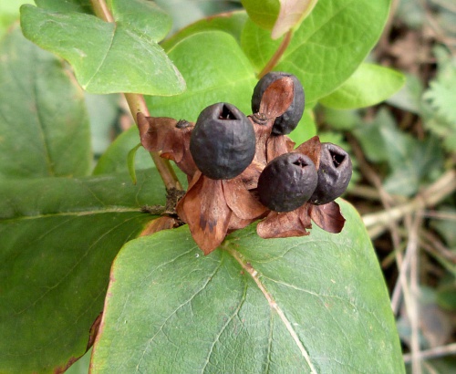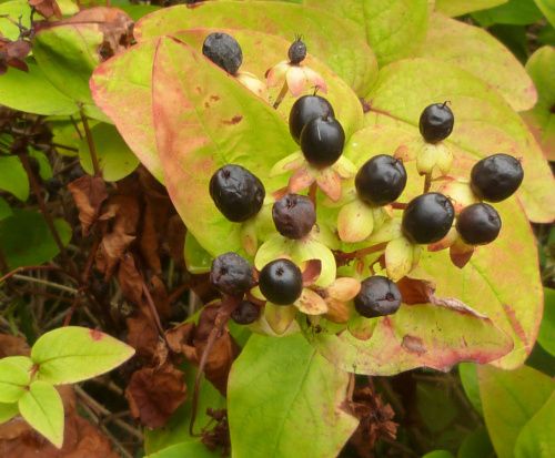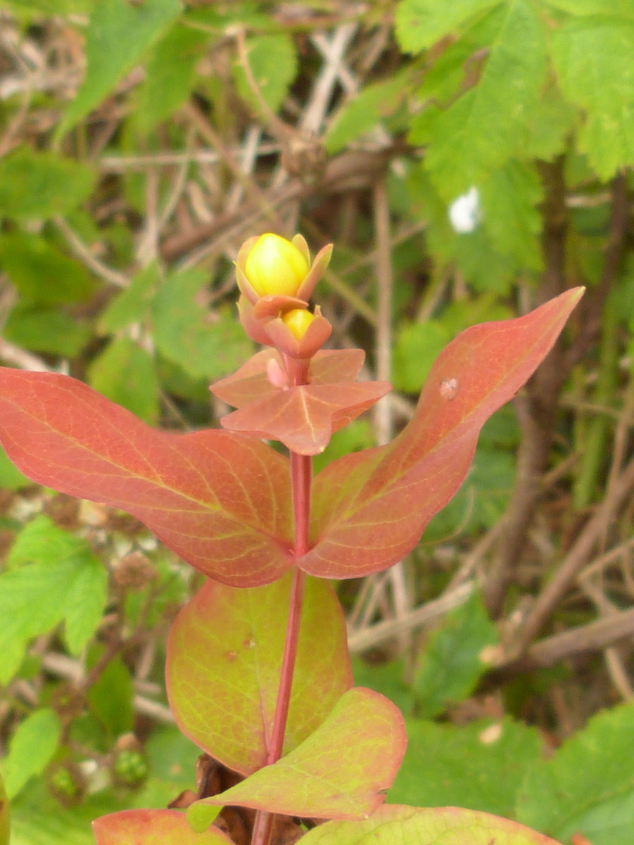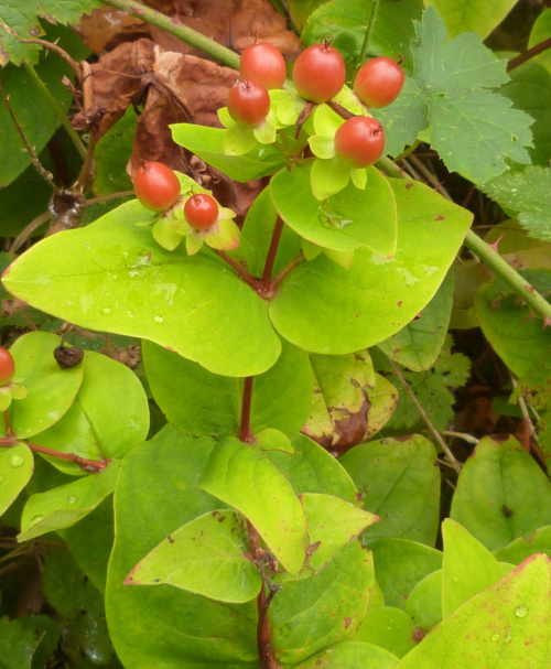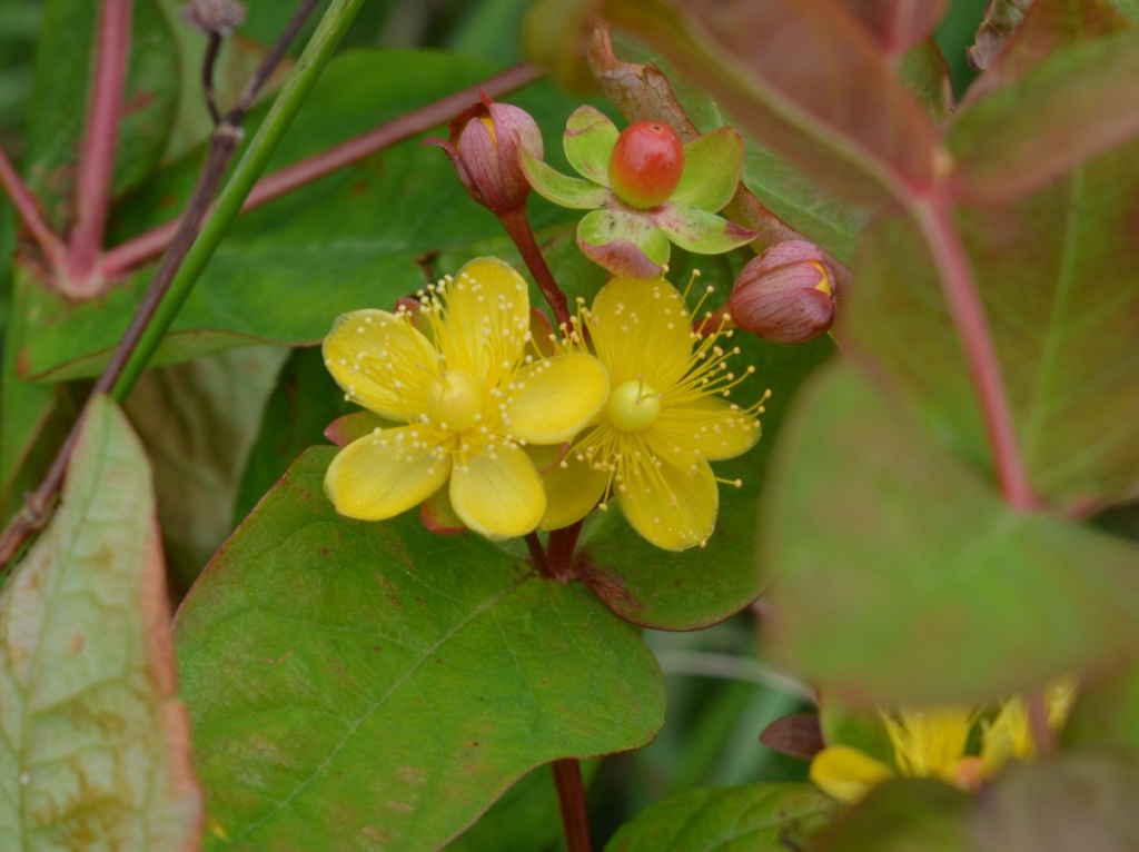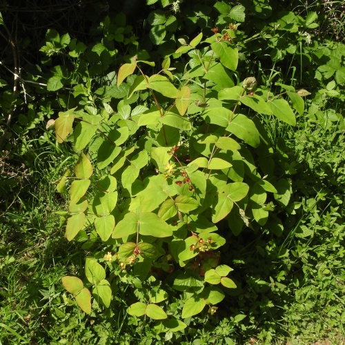 There are several other shrubby Hypericum, all garden escapes. The hybrid with Stinking Tutsan (Hypericum x inodorum) has petals longer than sepals and a faint unpleasant smell when bruised, and the cultivated variety 'Elstead', with red fruits, is frequently planted.