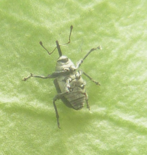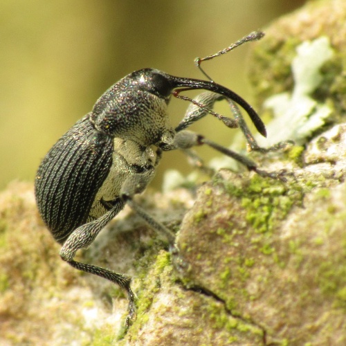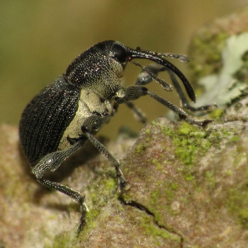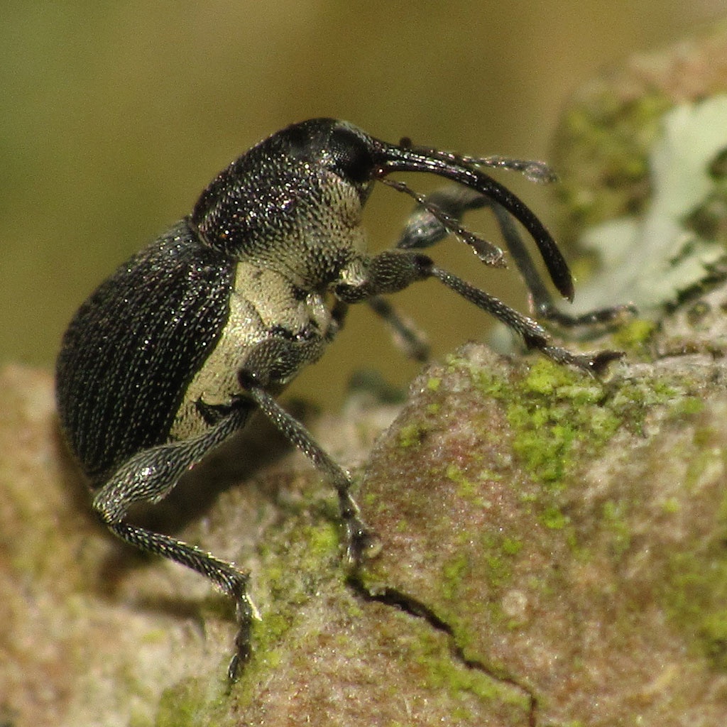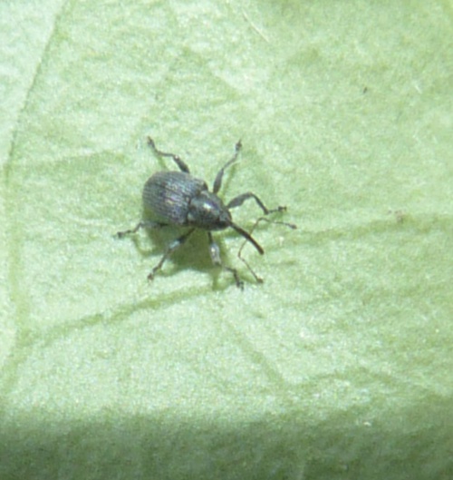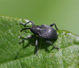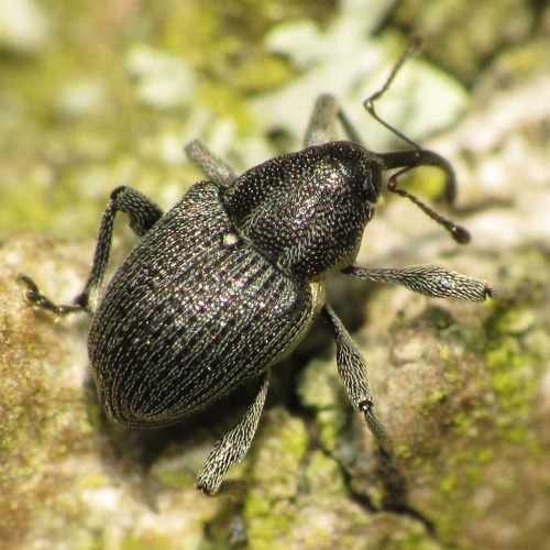 Length: head and body (not the curved snout) 2.5 mm. A black weevil with tapered body, long snout with antennae midway along, black rostrum and antennae. Also known as Curculio salicivorus.
