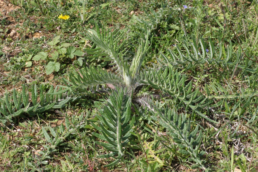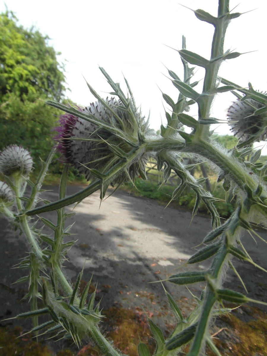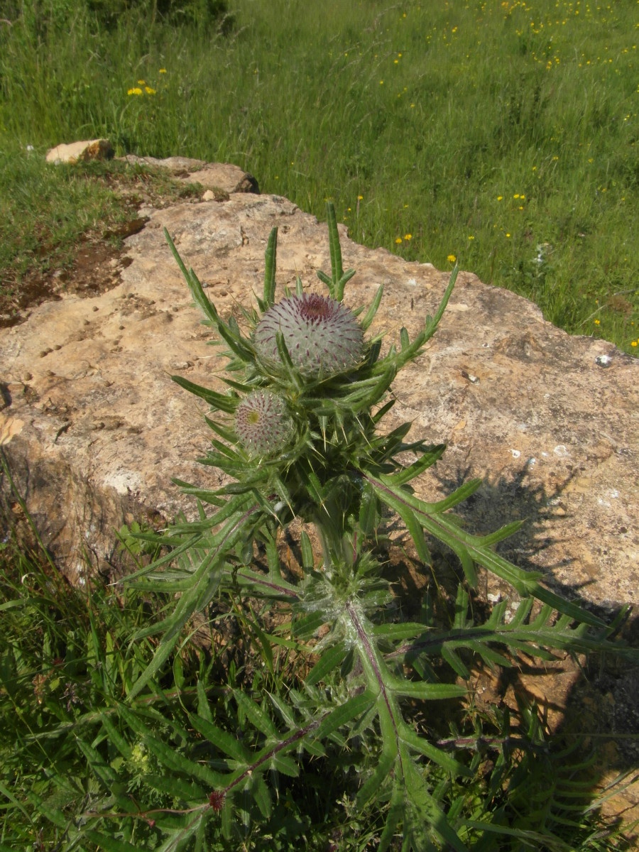 Medium to tall stout plant that may reach 1.5 metres. Stems are unwinged, white-cottony usually branched above. Leaves pinnately lobed, with long ridged spines, white cottony beneath. Flowerheads are large, cottony-hairy, reddish purple 25 to 50 mm; usually solitary, erect, outer flower bracts recurved and spine tipped.