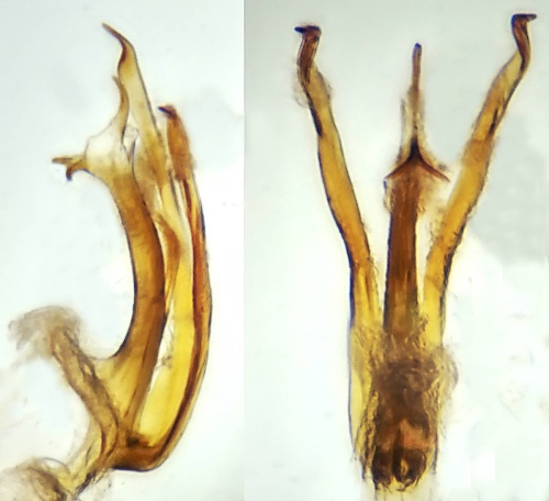 Many species show sexual dimorphism - the males and females are different in size and coloration. Identification of some species can be very difficult, often involving dissection of the male to examine the internal genitalia - the aedeagus and parameres. The 'aedeagus' is a chitinious structure, often of very complex shape, analogous to the penis in mammals. The 'parameres' are also known as the anal styles or claspers. Females are often more difficult to identify, and are sometimes impossible.
