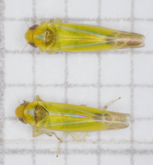 Most species are small - less than 5mm - and fragile, with a long narrow shape. All the UK species are long-winged. Yellow or green is a common colour; some genera are attractively mottled, streaked or marbled in brown or black over a greenish base colour. A few species have red patterns - e.g. Zygina. Species can be very difficult to identify - Edwardsiana and Kybos are particularly difficult. For some species, dissection of the male to examine internal genitalia is needed (e.g. see Edwardsiana lethierryi and Ribautiana tenerrima male aedeagus); females can be impossible to identify.